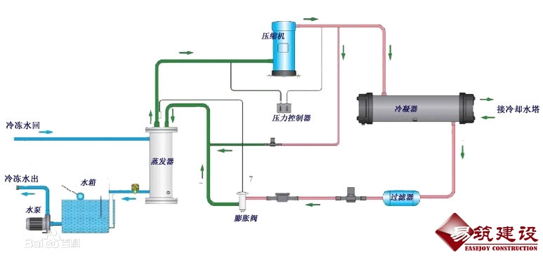 冷水机组包括四个主要组成部分:压缩机,蒸发器,冷凝器,膨胀阀,从而实现了机组制冷制热效果。